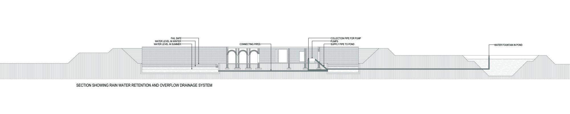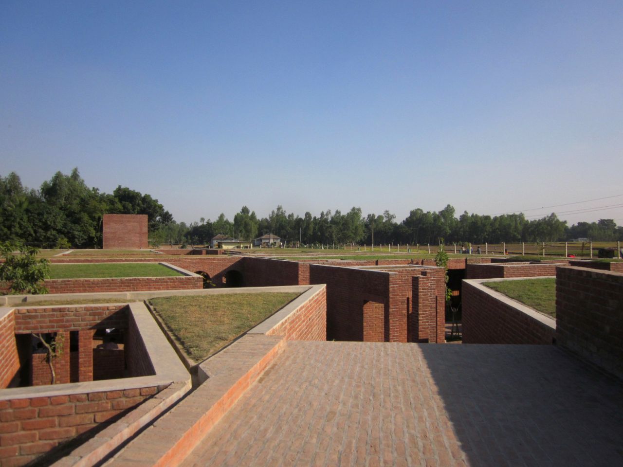 “The low lying land, which is located in rural Gaibandha where agriculture is predominant, is under threat of flooding if the embankment encircling the town and peripheries break. An extensive program with a very limited fund meant that raising the structures above flood level (a height of eight feet) was not an option: nearly the entire available fund would be lost below grade. Being in an earthquake zone and the low bearing capacity of the silty soil added further complications. The … design relies on a surrounding embankment for flood protection while building directly on existing soil, in load bearing masonry. Rainwater and surface run-off are collected in internal pools and the excess is pumped to an excavated pond, also to be used for fishery. The design relies on natural ventilation and cooling, being facilitated by courtyards and pools and the earth covering on roofs. An extensive network of septic tanks and soak wells ensure the sewage does not mix with flood water . . . As in construction, so in conception – the complex of the centre rise and exist as echo of ruins, alive with the memory of the remains of Mahasthan (3rd century BC), some sixty kilometers away. Constructed and finished primarily of one material – local hand- made bricks – the spaces arc woven out of pavilions, courtyards, pools and greens; corridors and shadows. Simplicity is the intent, monastic is the feel. The centre serves and brings together some of the poorest of poor in the country and -by extension – in the world, yet in the extreme limitation of means was a search for the luxury of light and shadows of the economy and generosity of small spaces; of the joy of movement and discovery in the bare and the essential.” (URBANA)