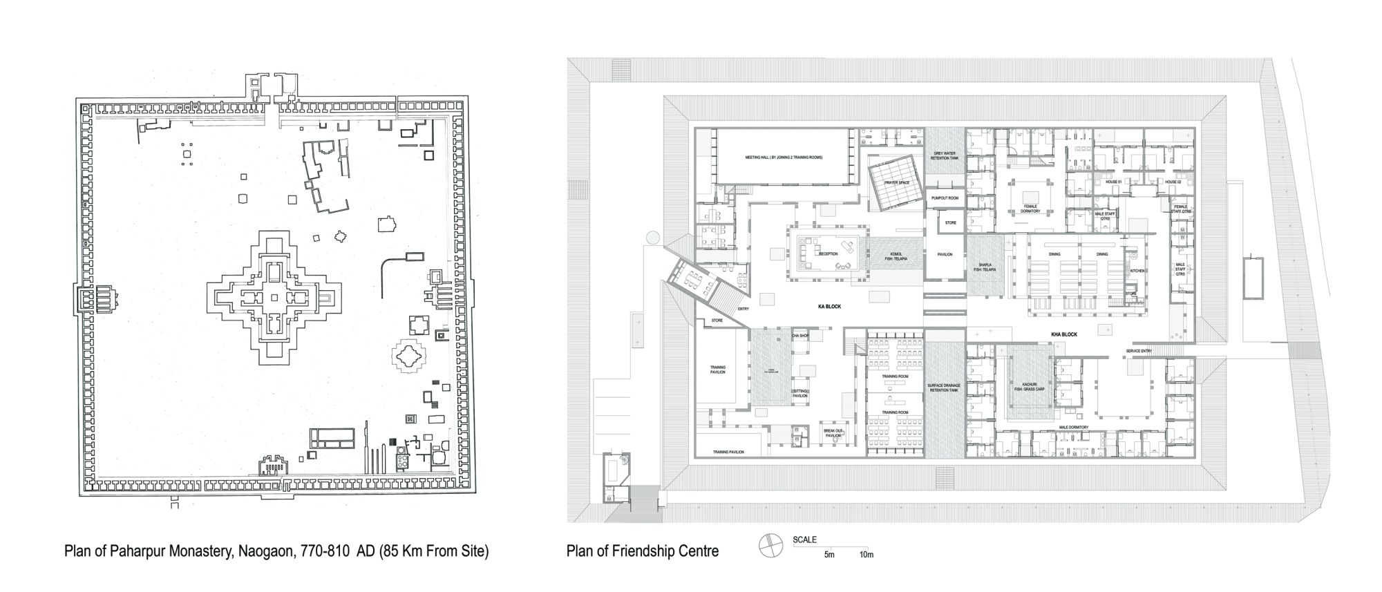 Conceived by the Dhaka-based architect Kashef Mahboob Chowdhury not as a building but as collection of pavilions, open courts, pools and walkways, the buildings house offices, a library, meeting rooms and pavilions, a prayer space, and a tearoom. A separate area contains dormitories and spaces for private functions. The laundry and drying shed is located on the other side of the pond. There is no air-conditioning in the complex; fractured and pavilion-like building volumes allow for natural ventilation and cooling, also facilitated by courtyards and pools, and earth-covered green roofs.