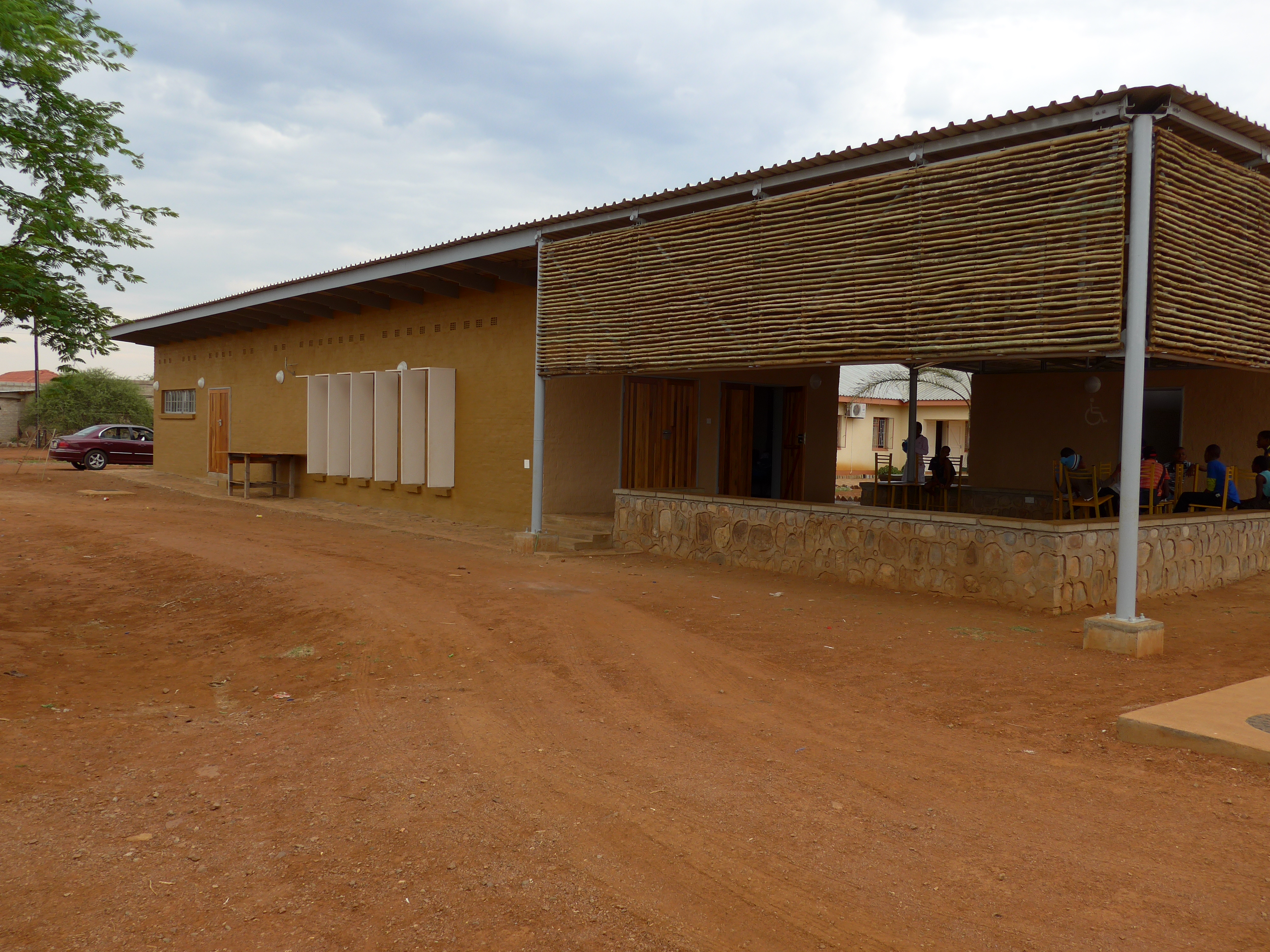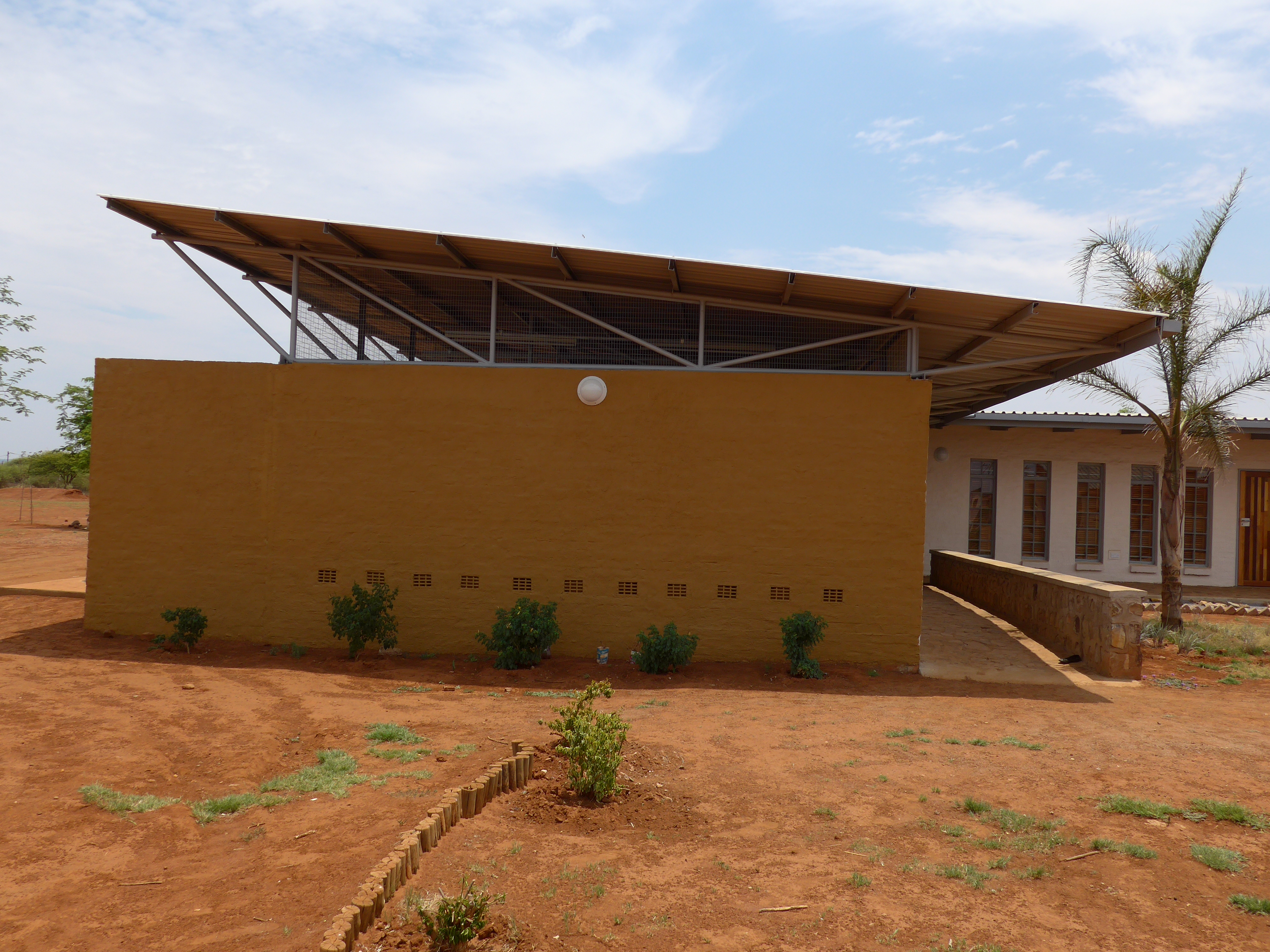 … The building orientation and roof overhangs are carefully designed to minimise heat gain during the summer months and to maximise heat gains during the winter months. The mono pitch roof and soffit creates tall spaces, further minimising overheating. The roof is made of IBR sheeting with a white Chromadeck finish to reflect heat and is insulated using recycled paper insulation … The roof is fitted with gutters and rainwater downpipes to facilitate rainwater harvesting and one of the rainwater downpipes will be connected to an existing water storage tank on the site. Local clay bricks are used in the wall construction, they were selected for their low embodied energy and good thermal properties.”