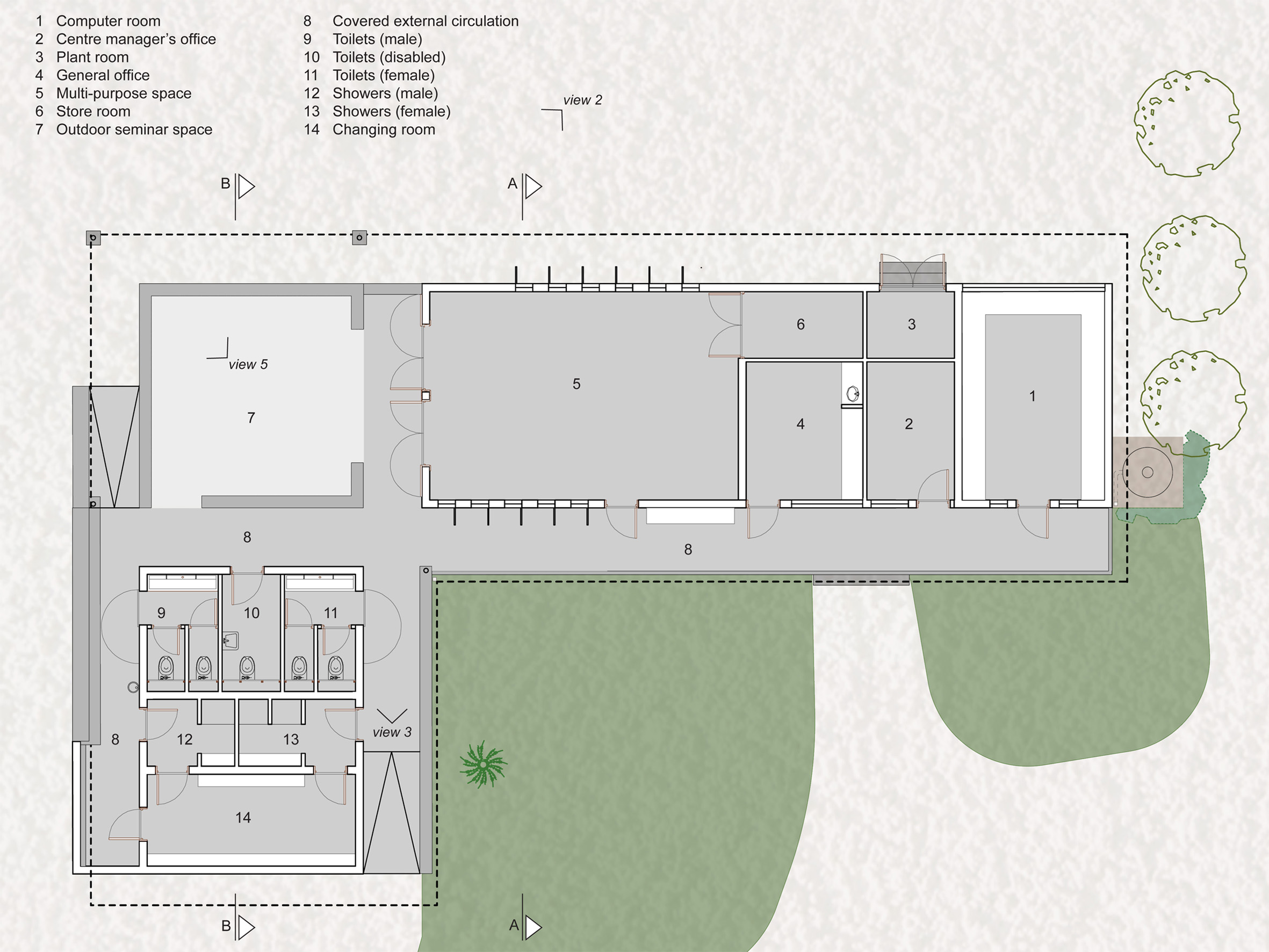 “The new Football for Hope Centre is located on the SEDYEA site, between the existing Youth Centre and the catering area, addressing both these spaces, and within close vicinity of the existing and the proposed football pitch. The approach to the new centre is via the existing landscape area around the Youth Centre. The L-shaped building forms a small arrival courtyard welcoming visitors and creating a sheltered social outdoor area. This courtyard is connected visually to the football pitches via the outdoor seminar room. The multi-purpose room, computer room and offices are all accessible directly off the courtyard via a covered circulation area. The outdoor seminar space is located facing both pitches to serve as a match planning area during practice sessions and a cover for the stage and spectator rest area during league days.