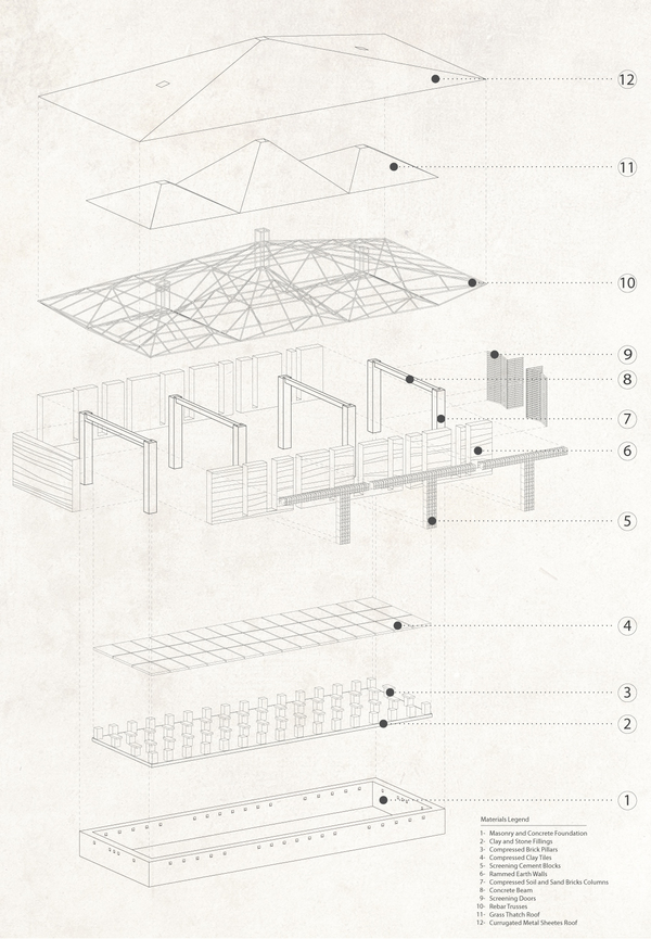 The main structure is made of compressed mud bricks using a hand operated compression machine. A minimal amount of concrete and steel are employed. The infill walls between the columns are non-structural rammed earth that is made of soil, and a small amount of cement. These walls are ventilated with fiber cement cylindrical tiles that may be made by the students on the site.