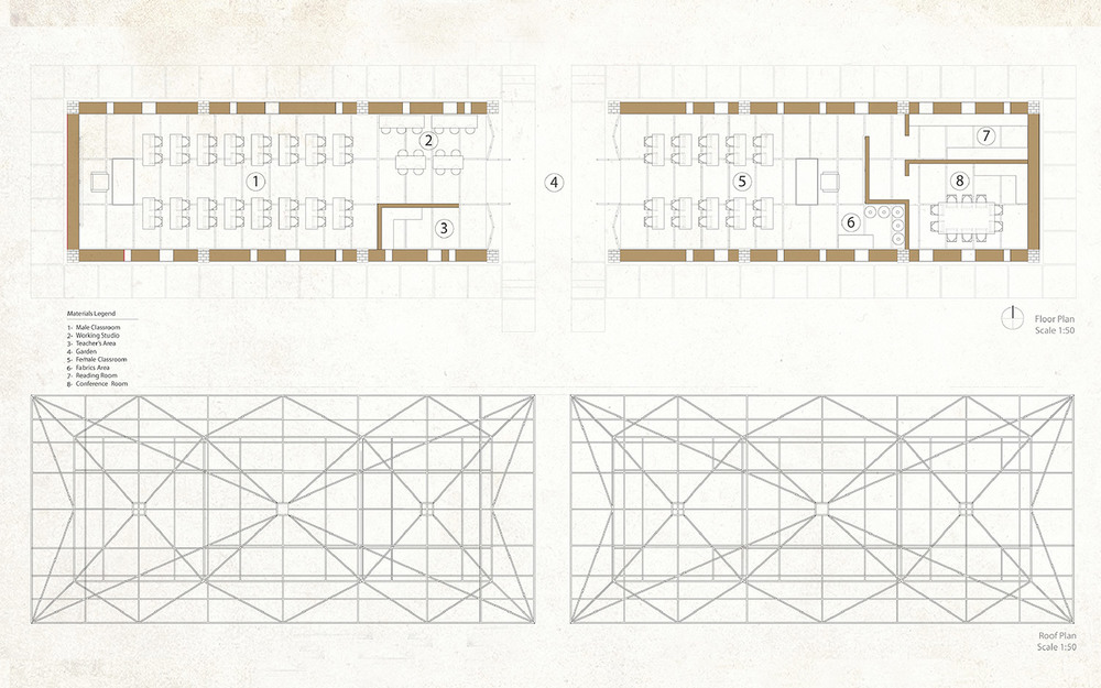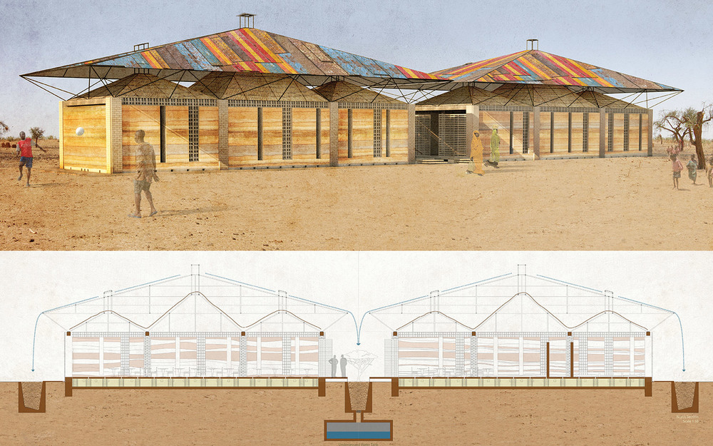 The building combines local building practices with contemporary sustainable principles. The rectangular open floor plan is designed to accommodate approximately 80 students (40 male and 40 female students). The thatched pyramidal roof structures is covered with a second reclaimed metal roof canopy which shades and protects the interior from the intense heat.