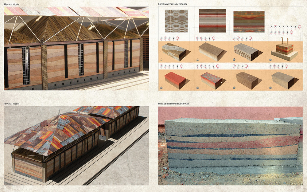 The project began with a study of available material and human resources. The materials were selected following an examination of local building practices of Sub-Saharan Africa. This includes compressed mud bricks, rammed earth, thatch roofing, recycled metals, and minimal amounts of concrete, and steel work.