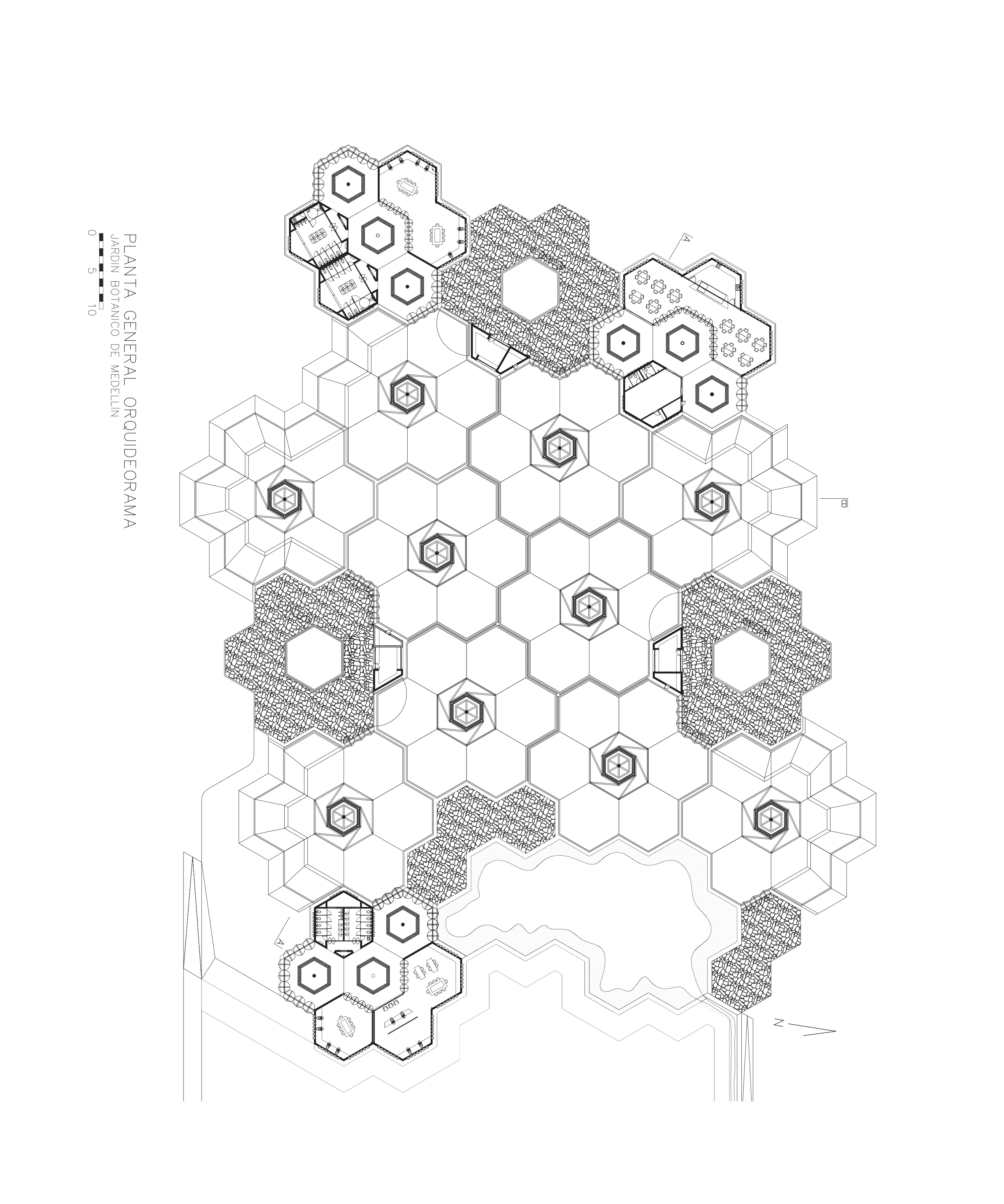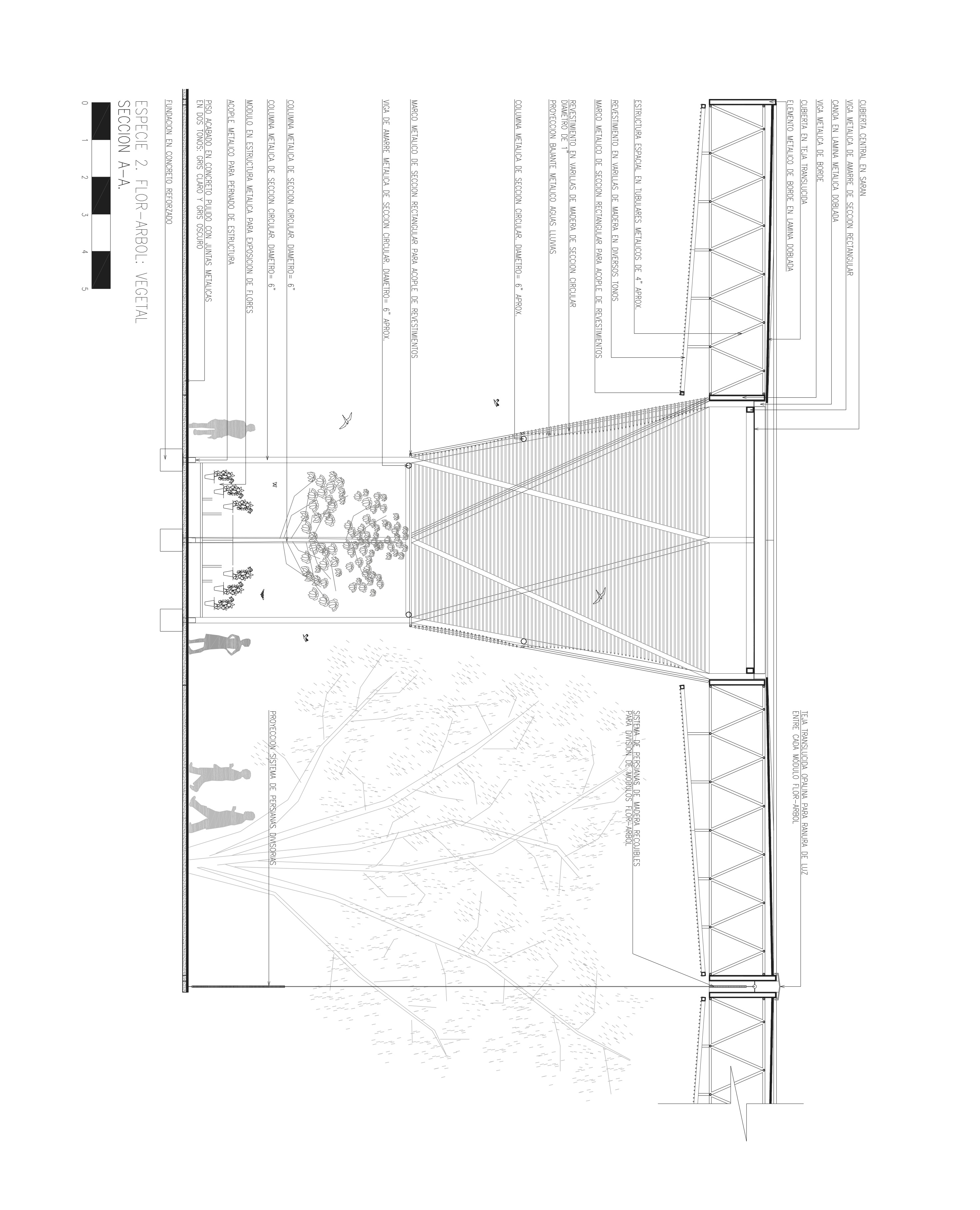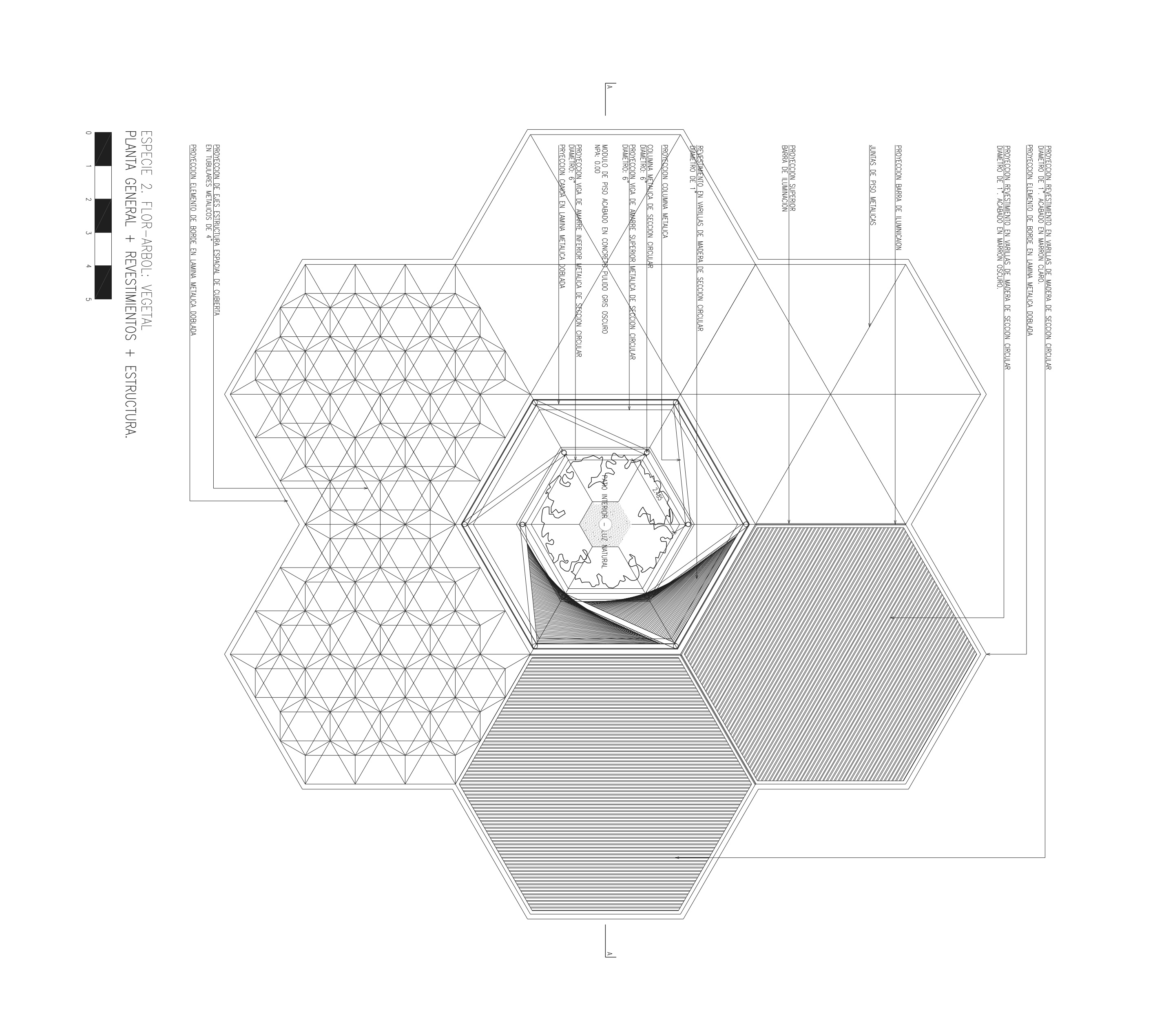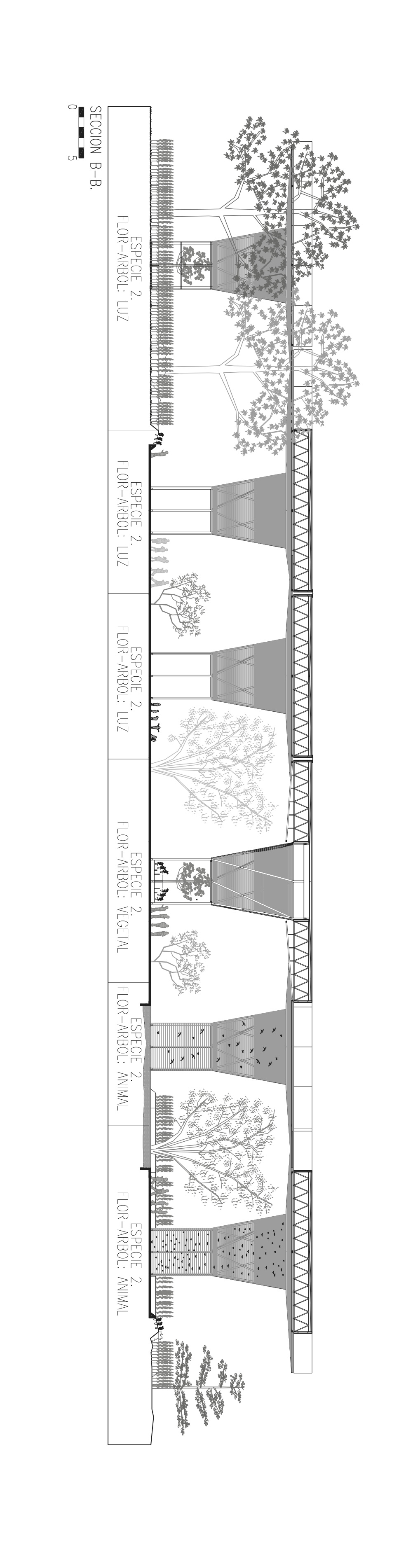 In terms of program, the flower-tree structure has three different contents according to location and needs. Each flower-tree is “hollow” in the center and each of them configures a small hexagonal patio. The patios have three different characteristics: